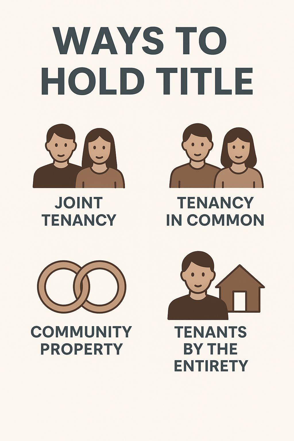When a married couple purchases a home, one of the most important — and often overlooked — decisions they’ll make is how to hold title to the property. The way title is held affects ownership rights, inheritance, and potential tax implications. Here’s a breakdown of the most common ways married couples can hold title in real estate, particularly in California and similar community property states.
