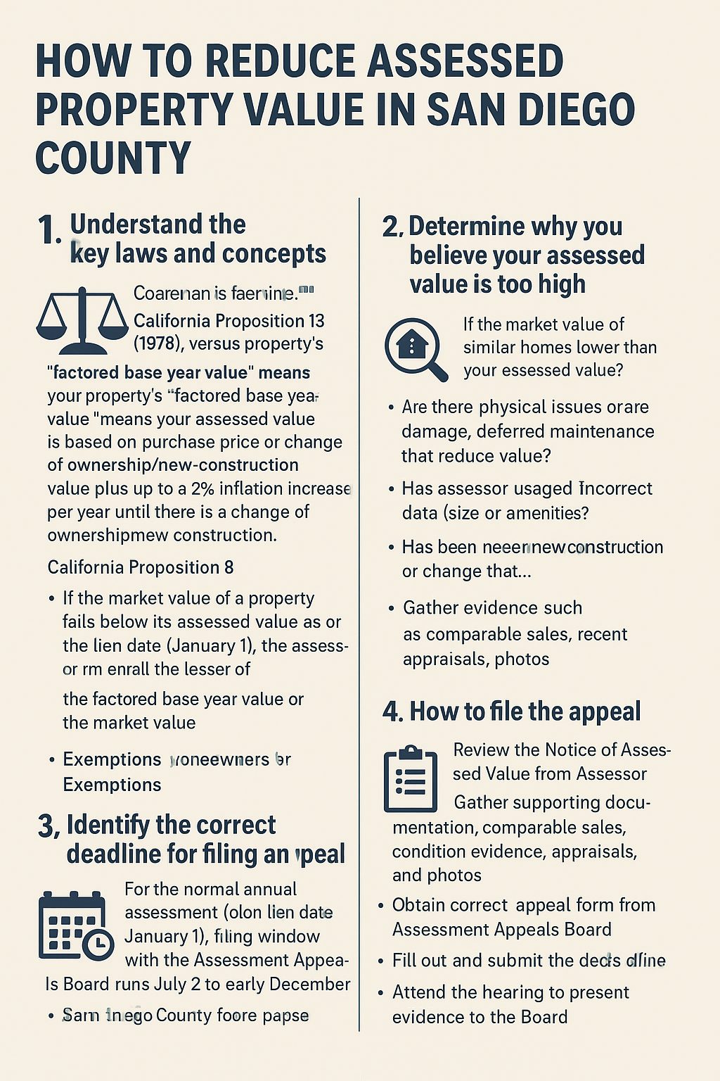 If you own property in San Diego County and believe the assessed value is too high, here are the main steps and options you can use to try to reduce your property’s value (and thus your taxes). I’ll walk you through the process and things to consider.