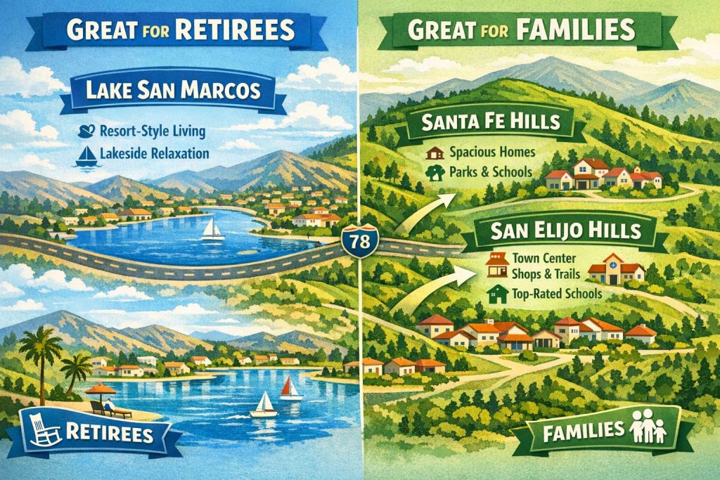 - Lake San Marcos is ideal for tranquility and scenic, lake-focused living—more for retirees than young families.